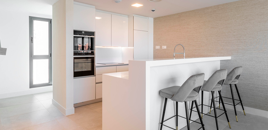 The kitchen, designed with leading brands, has been conceived as a whole within the main room: solid surface countertop, integrated appliances and integrated LED lights that provide sophistication and warmth. In the bathrooms, the elegance of the large-format porcelain tile has been chosen, a reflection and guarantee of design.
