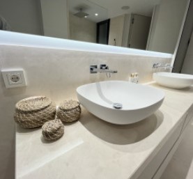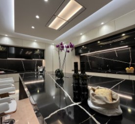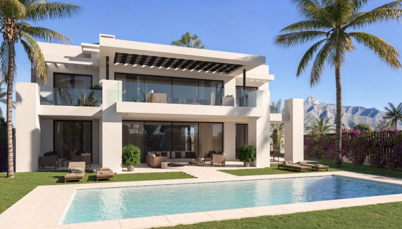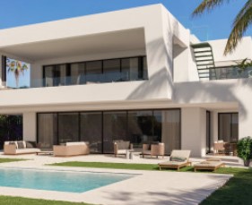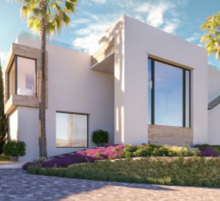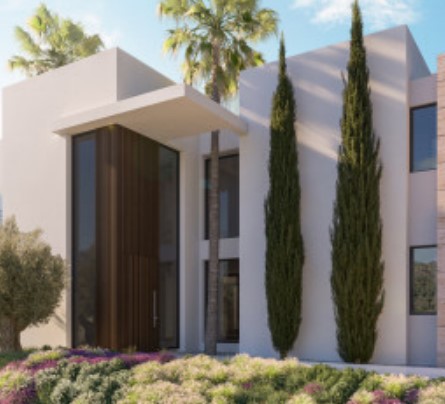 Residential área located in heart of the Golden Mile, within a gate community approximately 2 km from the prestigious 5 -star hotel Puente Romano and the beach and 3,5 km from the center of Marbella. This villa is part of the first pase, construction began in January and it’s completion is expected approximately of May 2023. On a plot of 2.104 m2, this villa has a total built área of 1.015 m2 and has 5 ensuite bedrooms. It’s distributed on the ground floor, first floor and basement as well as a solárium. The ground floor is super spacious and bright and it houses a living room with an open concept kitchen is completely equipped with high -end appliances and a central island where you can enjoy breakfast or an informal meal. The living room has a large open front to the different porches that sorround the property and lead to the beautiful pool.