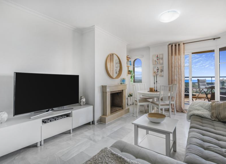 One of the standout features of this apartment is the expansive terraces, spanning 70m2. With both covered and uncovered areas, these outdoor spaces are perfect for enjoying the Mediterranean climate and breathtaking views of the sea, mountains, and communal pool and garden. The corner location of the apartment contributes to sunshine throughout the whole day.