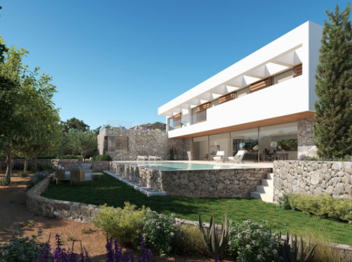of the garden with private pool area. The modern construction with large window fronts captivates by the integration of the country-typical natural stones of the external facades.