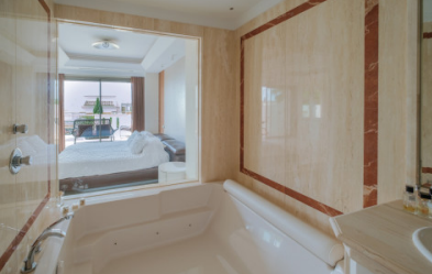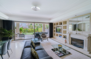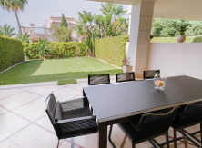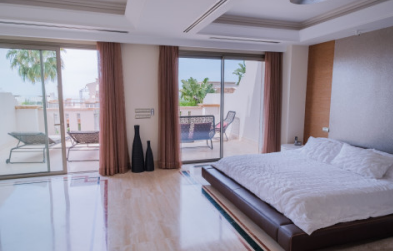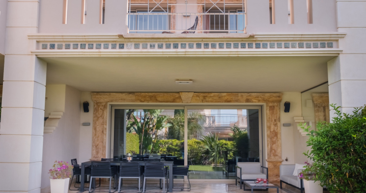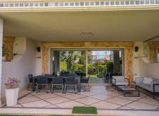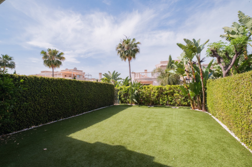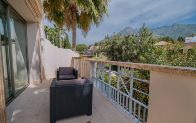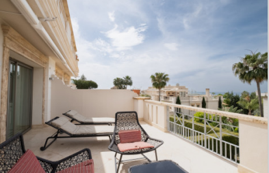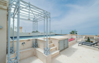 The townhouse is situated in a gated community in Sierra Blanca, which offers a tranquil ambient with beautiful gardens. It is distributed in 4 floors and there is an elevator connecting to all of them. On the main floor we have entrance, WC, separate kitchen, spacious living room with covered terrace and a spacious garden. On the 1st floor there are 2 bedrooms and two bathrooms, there is an option to make three bedrroms in this floor as well. One of them has a balcony facing community gardens, the other has a spacious sunny terrace. On the 4th floor- we have a small social room and two terraces: one with bbq and jacuzzi and the other one with sunbeds, private pool and stunning sea views. Basement is divided in to 2 bedrooms, laundry room, gym, storage room, sauna room and spacious garage for 2 cars.