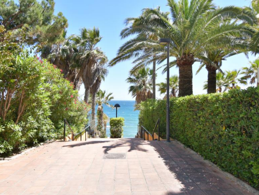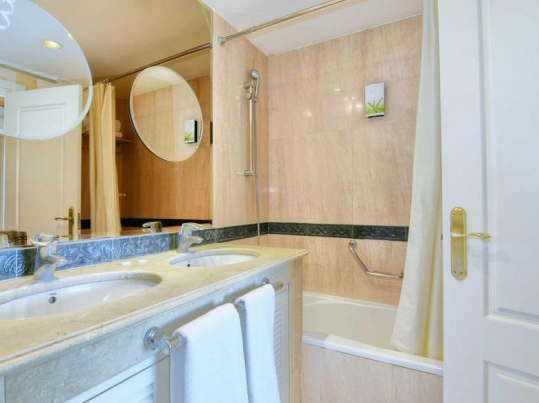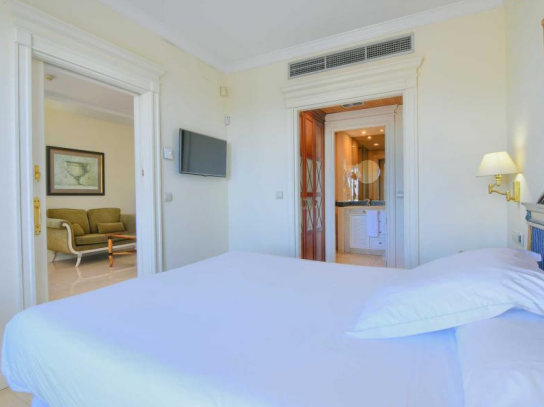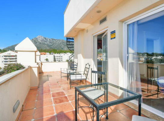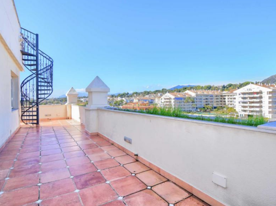 Beach side penthouse with panoramic views on the Golden Mile within the well known Hotel 5 * Guadalpín in one of the most sought after areas of Marbella just a short walk from the beach, the city center, close to international schools such as Swans Primary School and the British Scholl as well as all kinds of leisure and restaurant offers; allows you to enjoy the comforts of being part of a luxury hotel in the heart of the Golden Mile, ideal to enjoy as a second home or as an investment given its high profitability potential. It has a parking space with its own number and right of use. It consists of entrance, fully equipped kitchen, living / dining room with access to the terrace. Large bedroom with wardrobe area and private en-suite bathroom with bathtub. The lower L-shaped terrace faces west and north. From here an external staircase leads to the solarium with Jacuzzi, hammock area for sunbathing, upper awnings and beautiful views of the sea, the city and La Concha