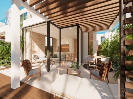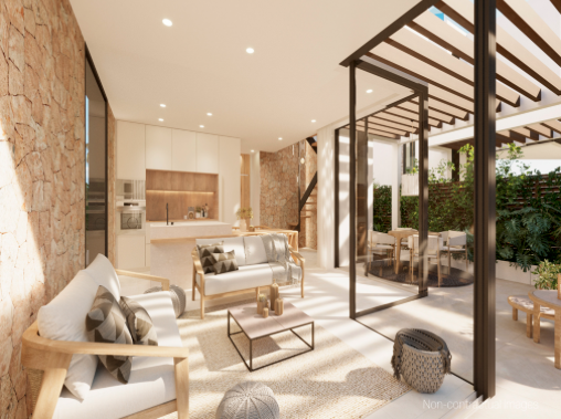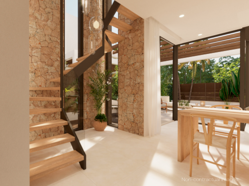 This new built house is located in the short distance from the beautiful sandy beach of Cala Tarida. The beach with its turquoise blue water also offers very good restaurants as well as the popular Cotton Beach Club. A total of 134 houses of this type will be built.
