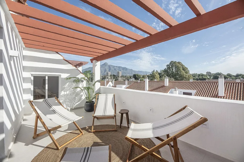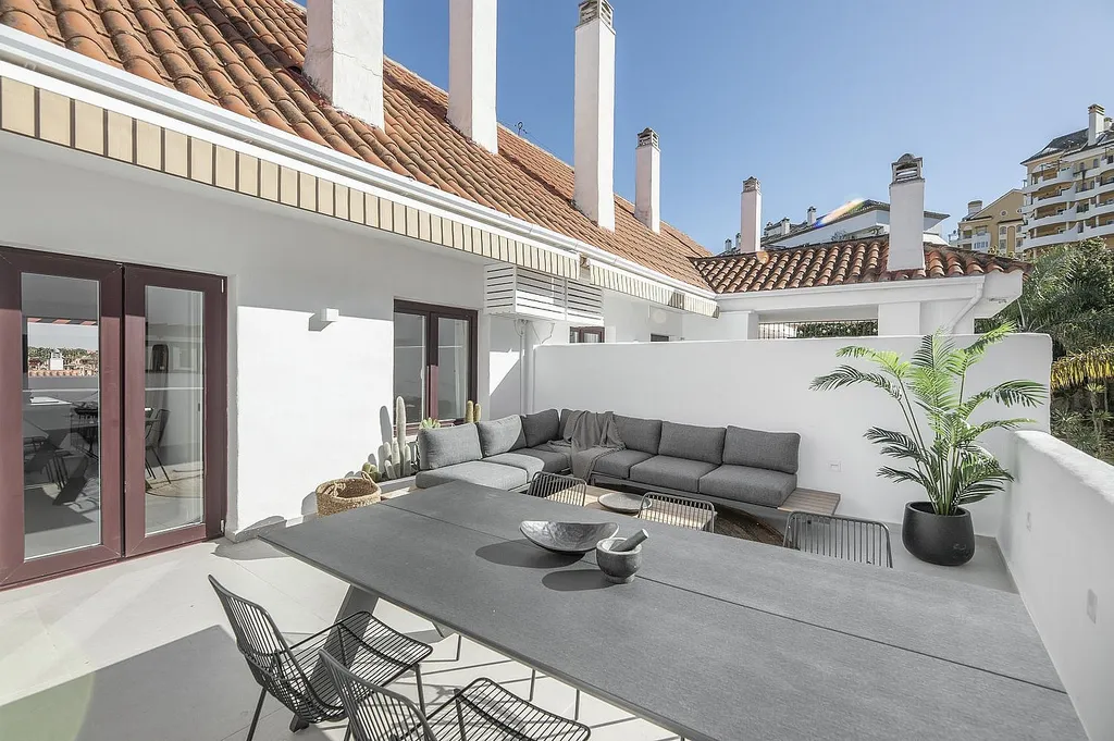 Recently renovated duplex penthouse is situated in an Andalusian style gated community. Within walking distance of all services, Centro Plaza and Puerto Banus. The community offers 24/7 security, 2 pool areas- one of them with a heated pool.