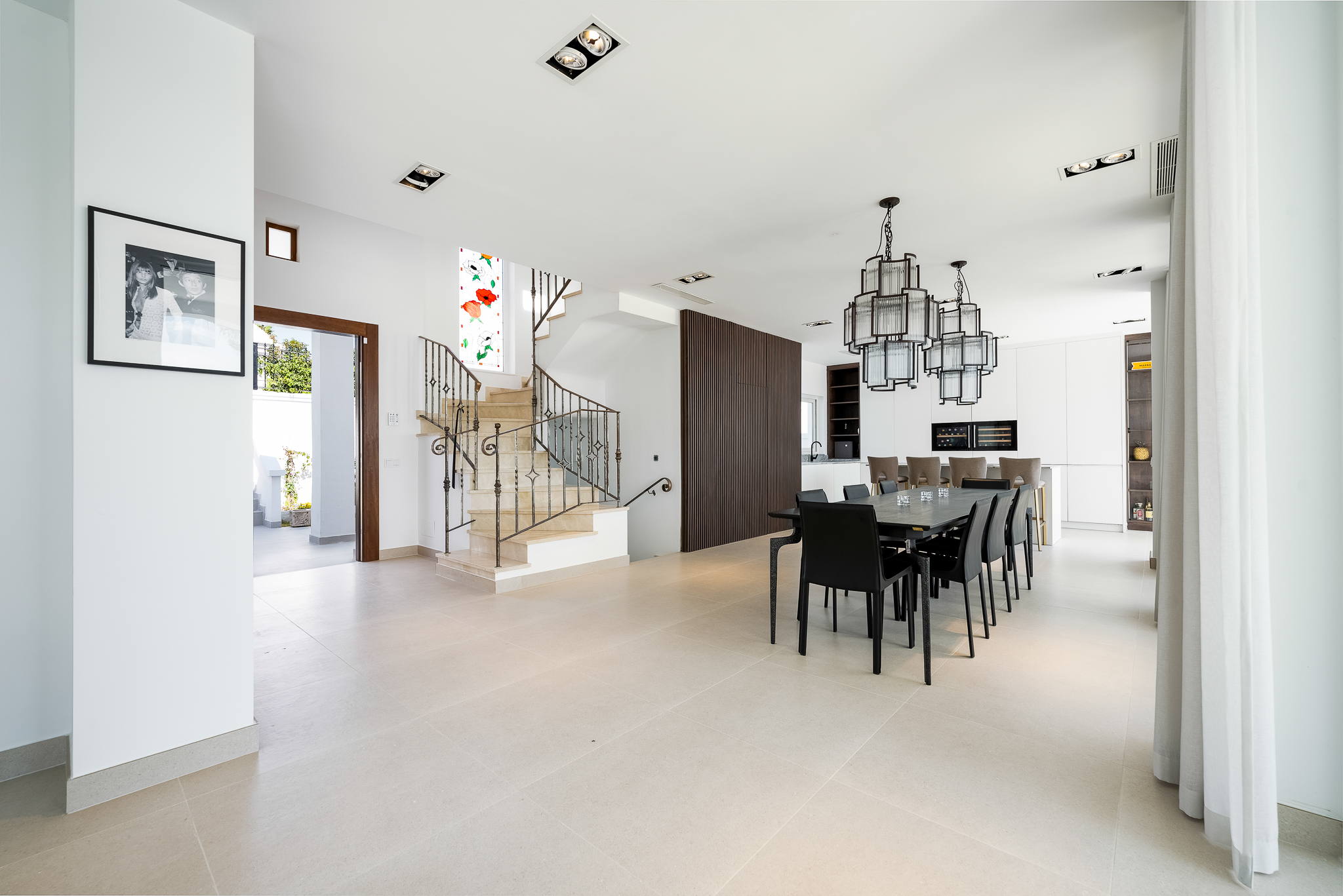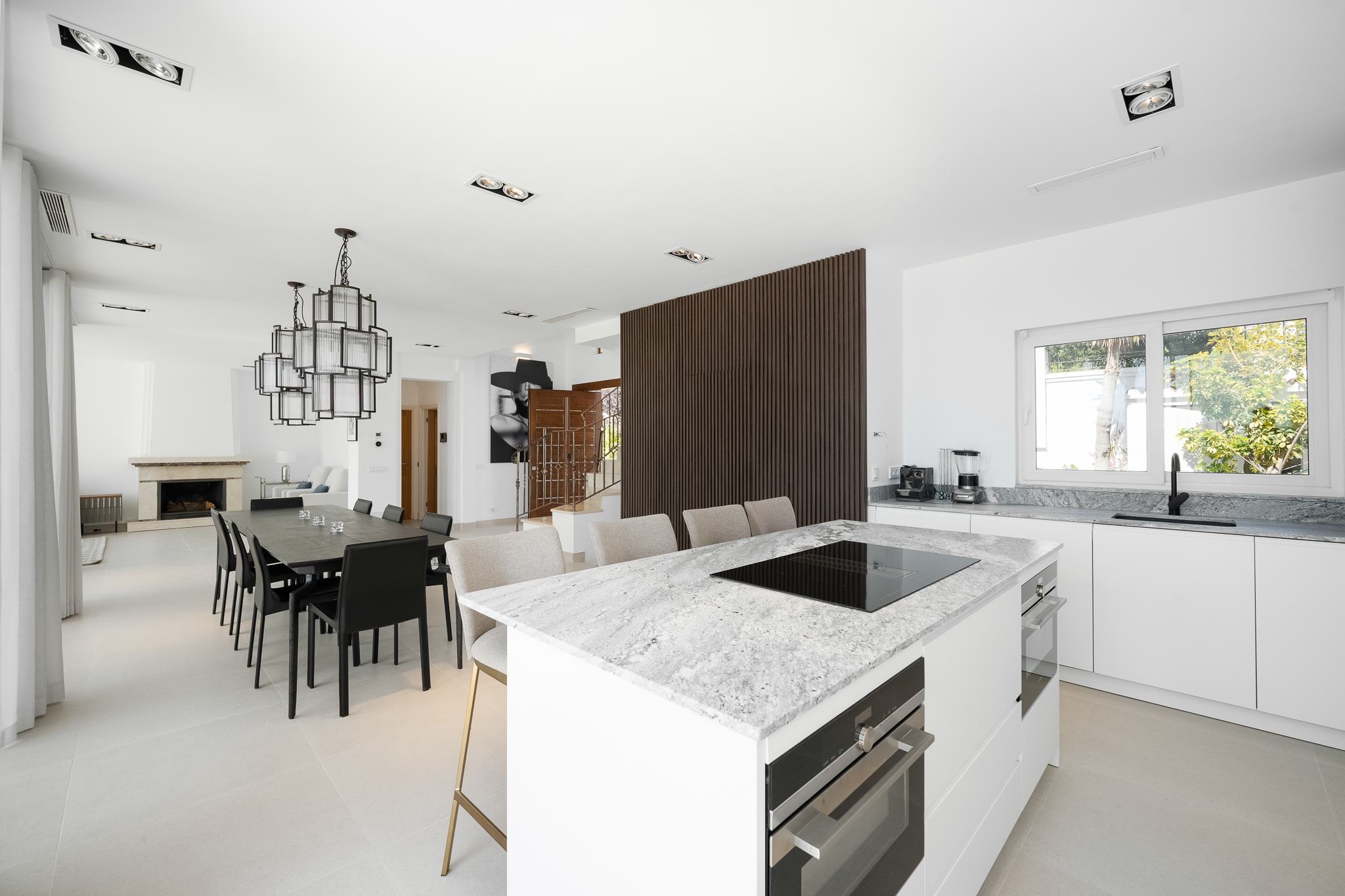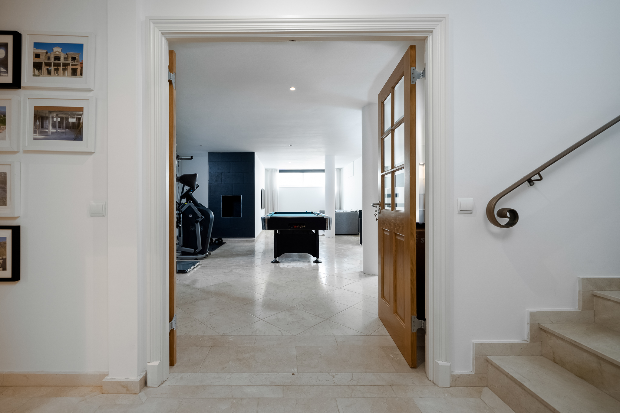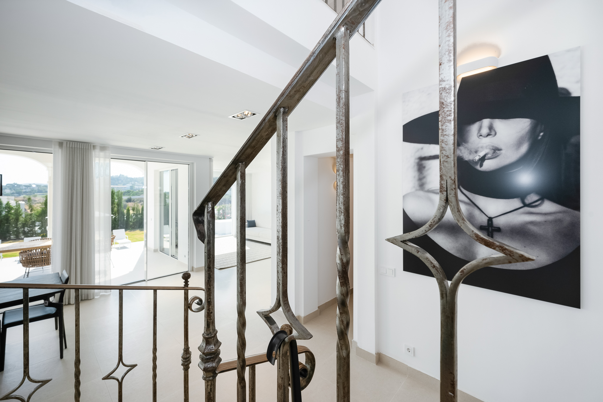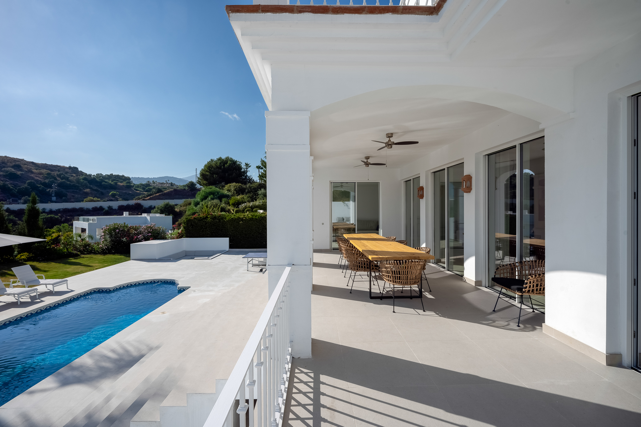 Partly refurbished 7 bedroom villa in Nueva Andalucia. This villa is conveniently located on a cul de sac road, just around the corner from all amenities. Only a 2-minute drive to Los Naranjos Golf Club, and a few minutes drive to many other golf courses in Nueva Andalucia. When you enter, you’ll find a refurbished, modern kitchen with a separate laundry room, a bright and airy dining and living area with large windows, and access to the terrace, pool, and garden area which is perfect for outdoor dining. A guest bedroom and bathroom are also located on the ground floor, with direct access to the patio. One floor up you will find 3 bedrooms, all with their own bathroom. From all the bedrooms you can enter the large terrace that faces west and offers breathtaking views of the mountains and partly the sea. On the lower level, there are 3 guest bedrooms and two bathrooms. There is also a large space which is currently used as a gym/game/cinema which you can transform into anything you wish. There is also a garage on this level where you can fit one car