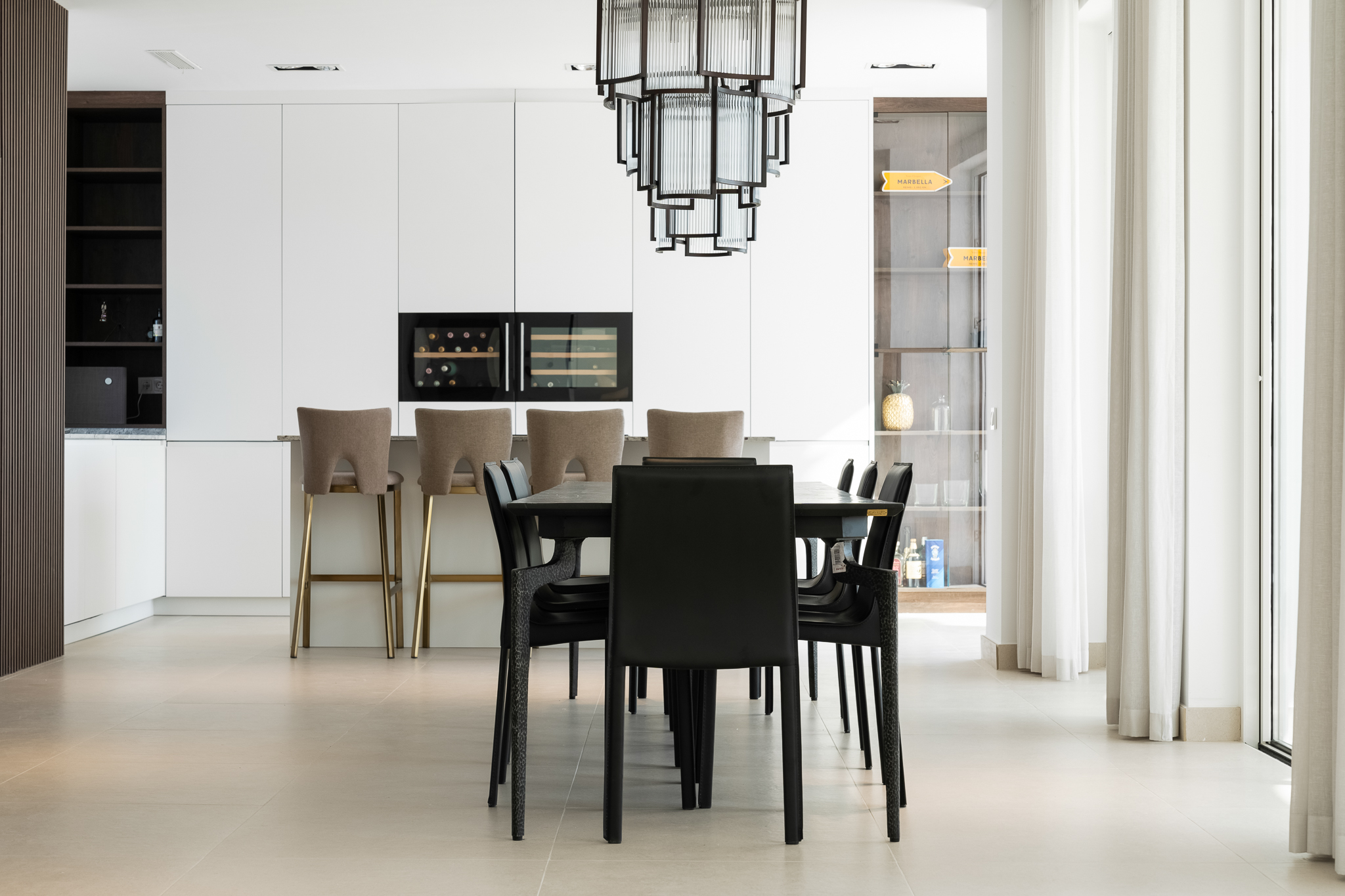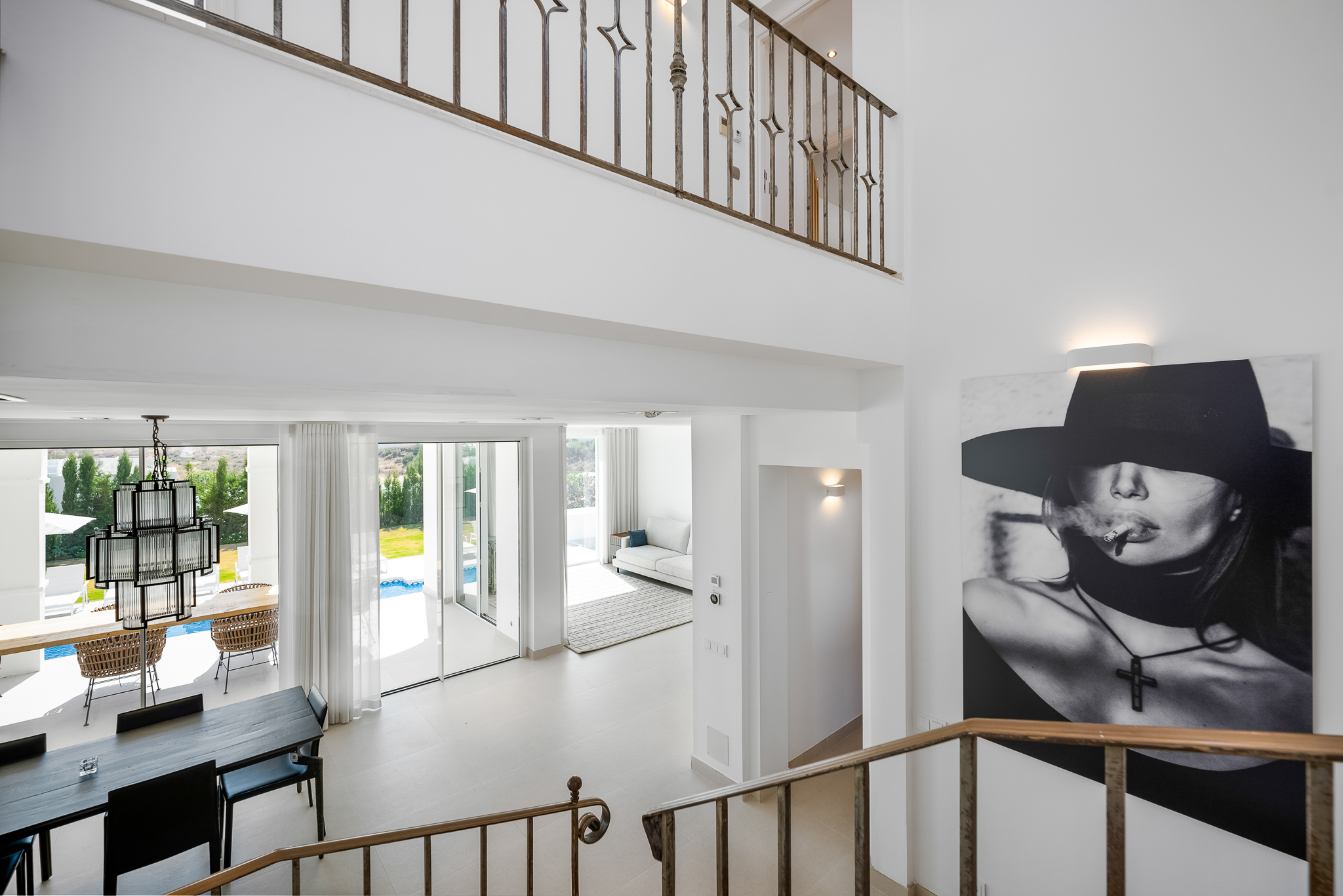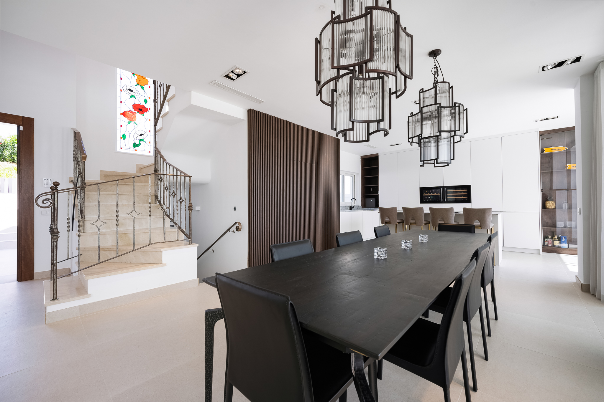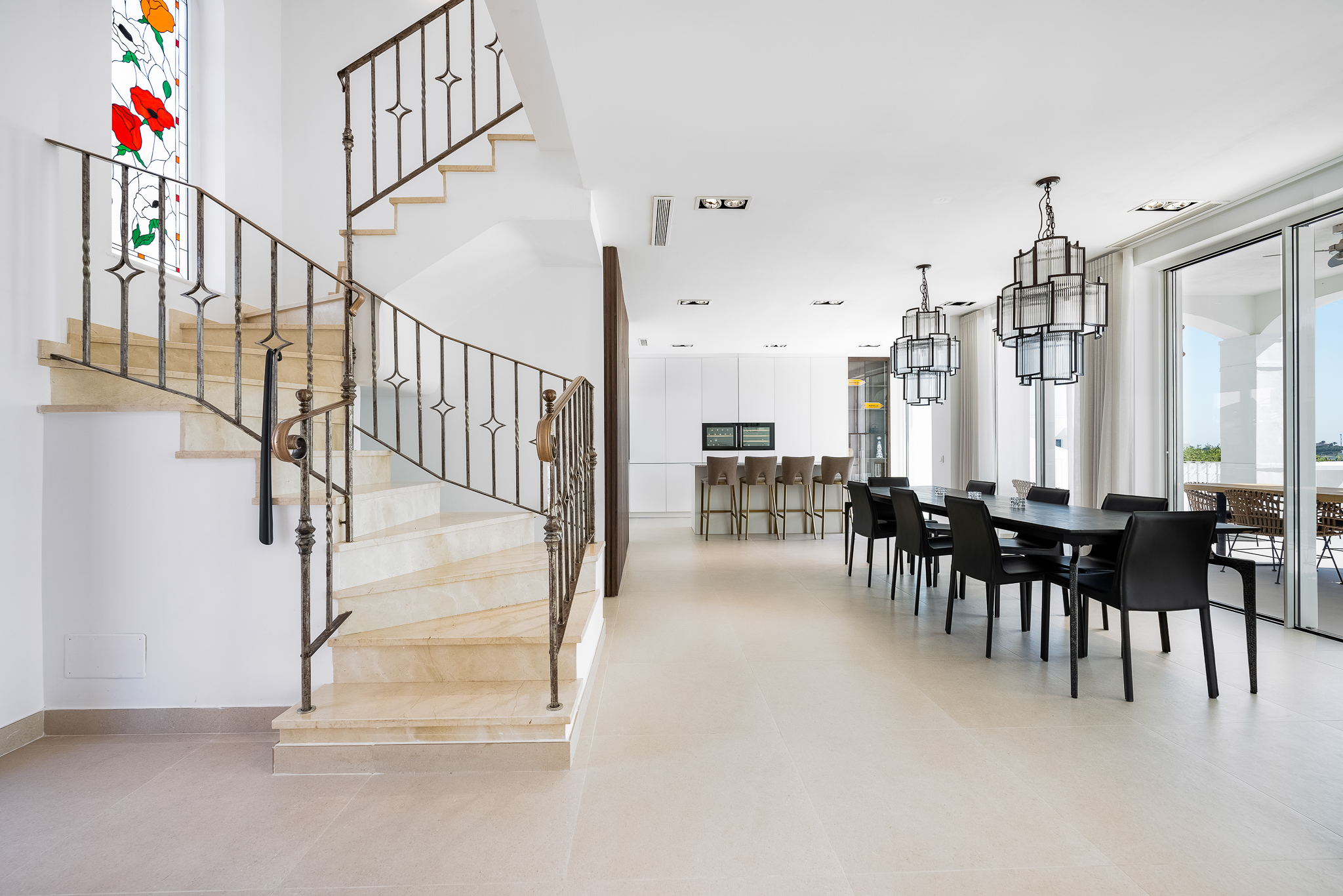Partly refurbished 7 bedroom villa in Nueva Andalucia. This villa is conveniently located on a cul de sac road, just around the corner from all amenities. Only a 2-minute drive to Los Naranjos Golf Club, and a few minutes drive to many other golf courses in Nueva Andalucia. When you enter, you’ll find a refurbished, modern kitchen with a separate laundry room, a bright and airy dining and living area with large windows, and access to the terrace, pool, and garden area which is perfect for outdoor dining. A guest bedroom and bathroom are also located on the ground floor, with direct access to the patio. One floor up you will find 3 bedrooms, all with their own bathroom. From all the bedrooms you can enter the large terrace that faces west and offers breathtaking views of the mountains and partly the sea. On the lower level, there are 3 guest bedrooms and two bathrooms. There is also a large space which is currently used as a gym/game/cinema which you can transform into anything you wish. There is also a garage on this level where you can fit one car