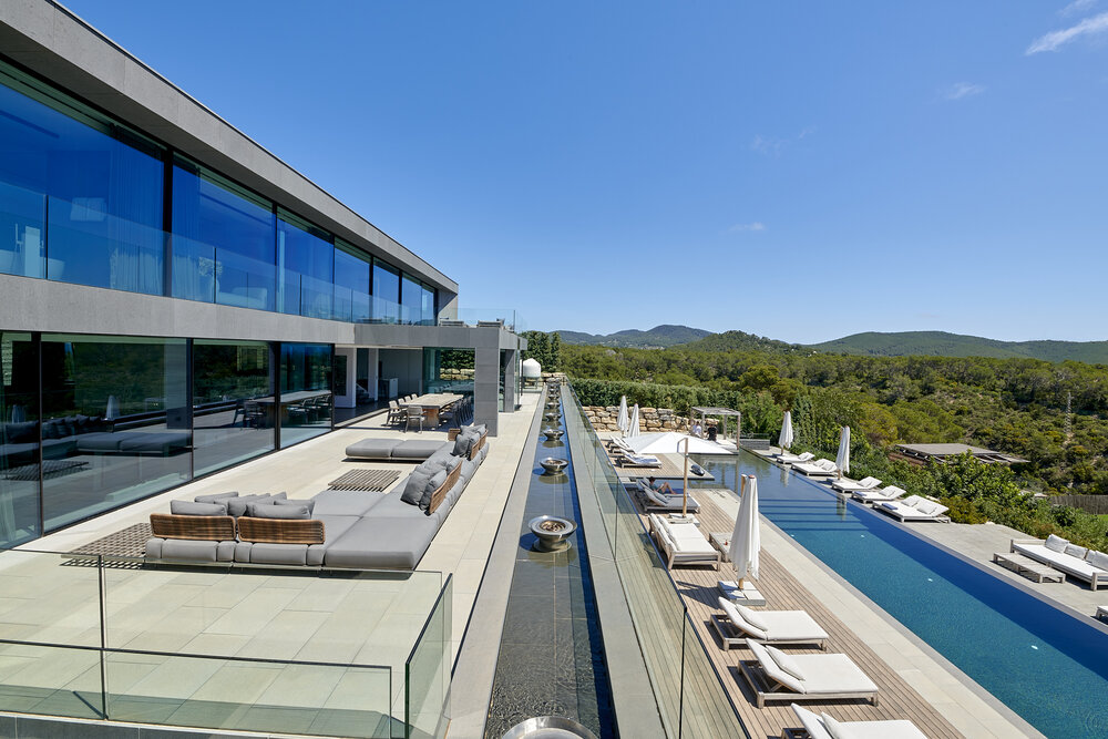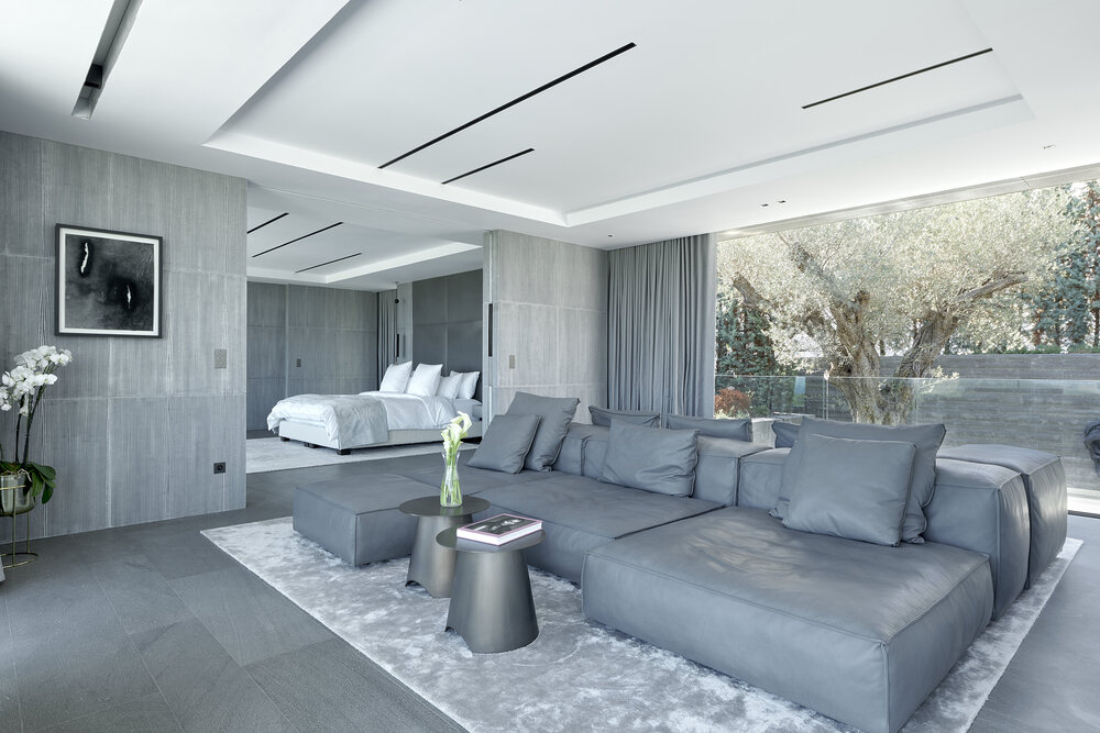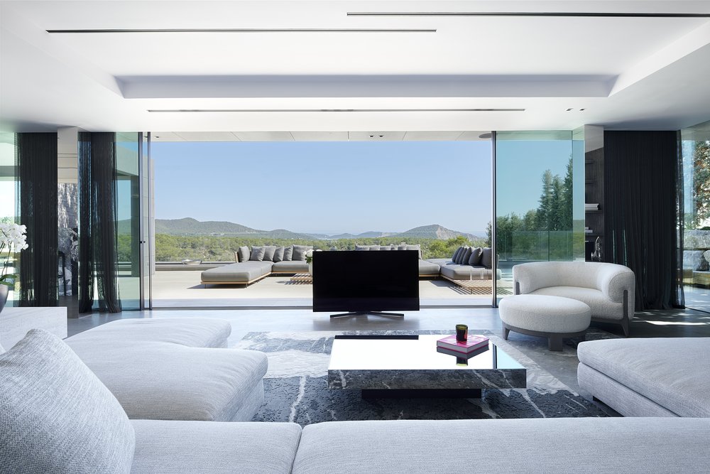 Open plan Living Room is equipped with large sofa, 360’ TV and fireplace, opening up onto marvellous terrace with chill-out area and breathtaking garden, sea and nature views.