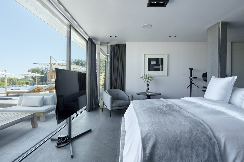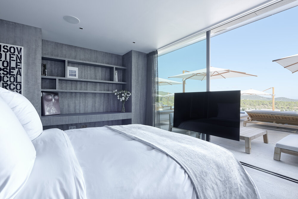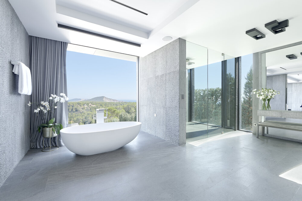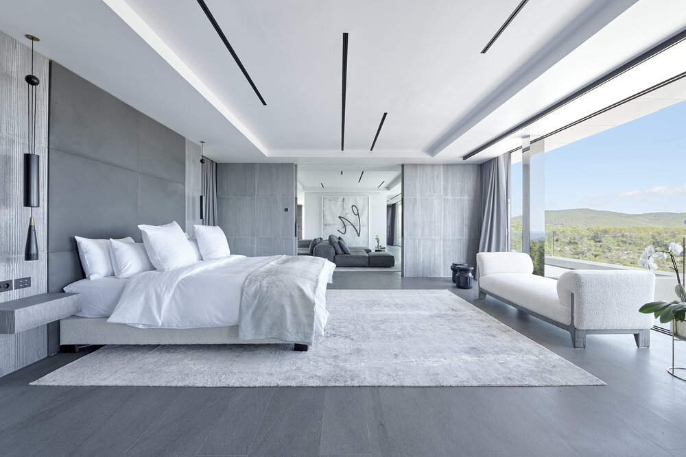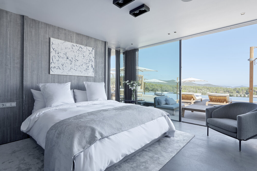 200 square meters of main Master Suite with 5 different areas: master bedroom, en-suite bathroom with outdoor shower, private living room, equipped office space with library, and walk-in closet. Two private terraces with panoramic views to the pool area, sea and nature.
