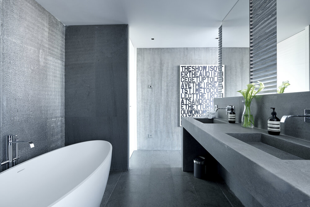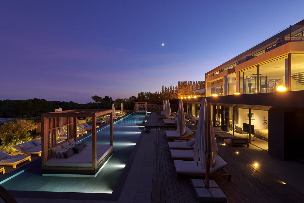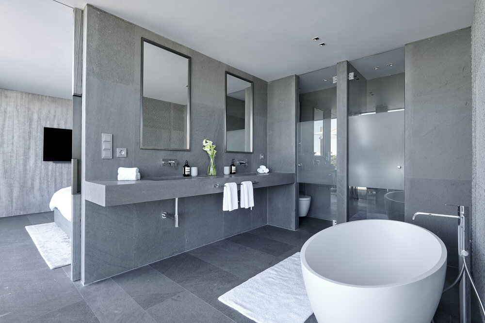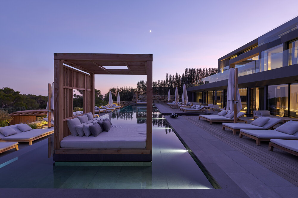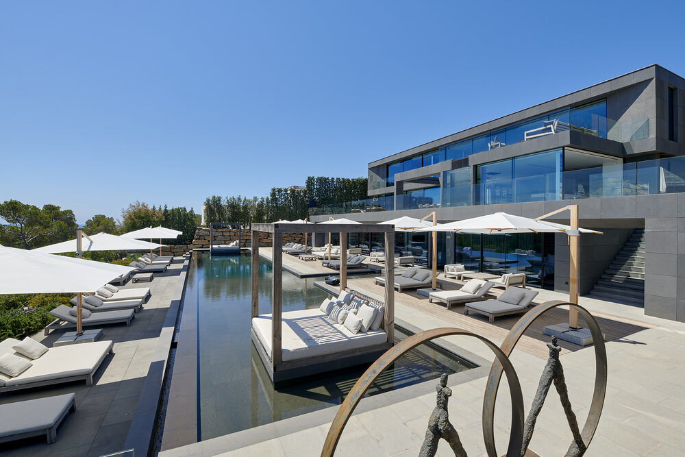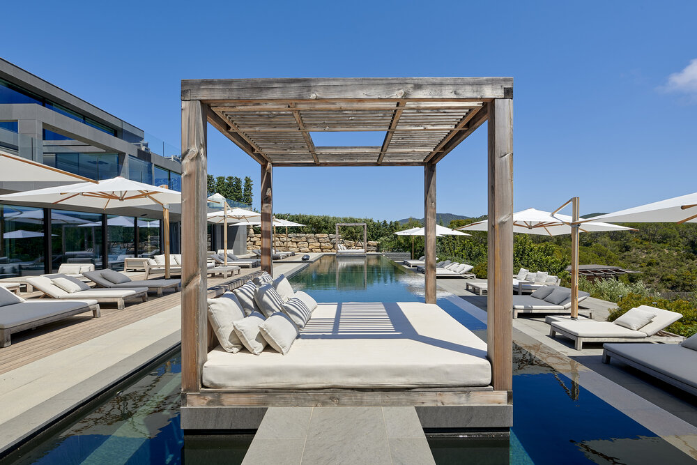 200 square meters of main Master Suite with 5 different areas: master bedroom, en-suite bathroom with outdoor shower, private living room, equipped office space with library, and walk-in closet. Two private terraces with panoramic views to the pool area, sea and nature.