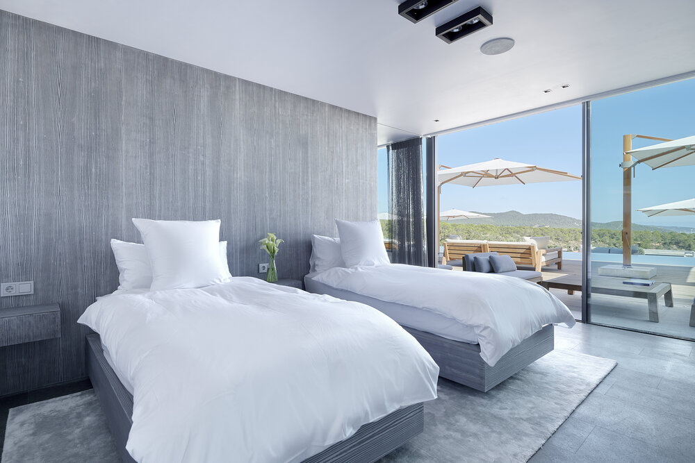2 Single beds shared bathroom with Bedroom 3 (bathtub & double sink & shower), safe box, AC, blackout blinds, opens up to swimming pool area with stunning views to nature and sea – Ground floor