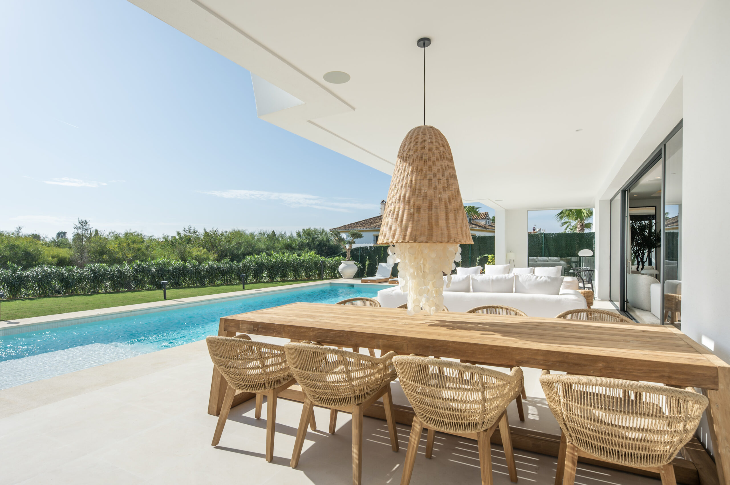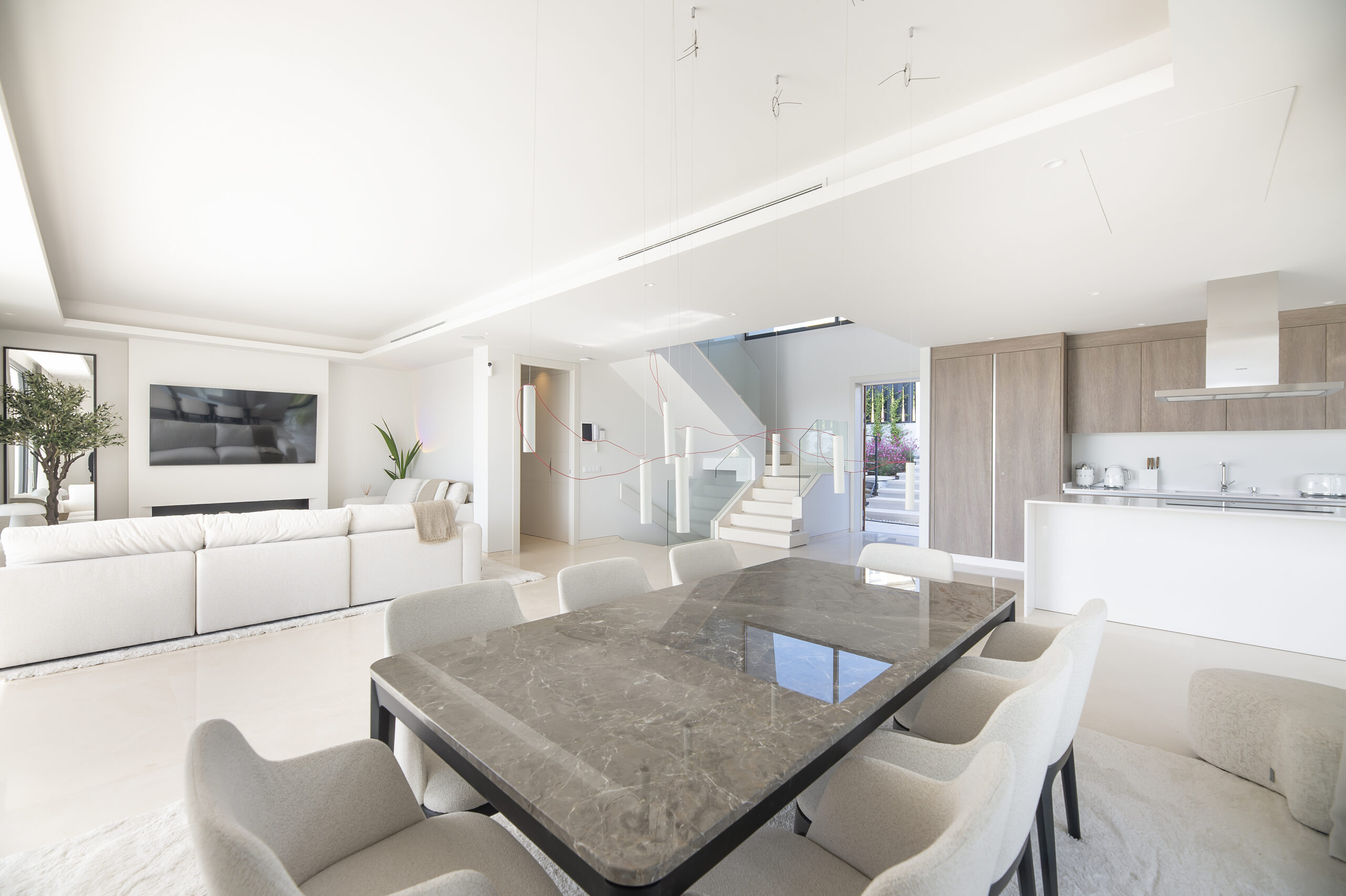 to a wrap around terrace. External staircase from the first floor leads to a huge terrace room. On the lower level there is extra space with natural light. It can be transformed to include playroom or a guest or staff bedroom suite. Outside there is a private garden, pool and carport for 2 cars